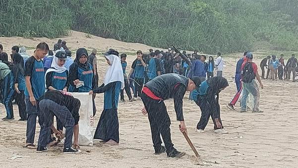 Ratusan siswa dan guru ini disebar di bibir pantai sepanjang 2 kilometer untuk menyisir sampah yang didominasi plastik dan styrofoam yang berserakan.