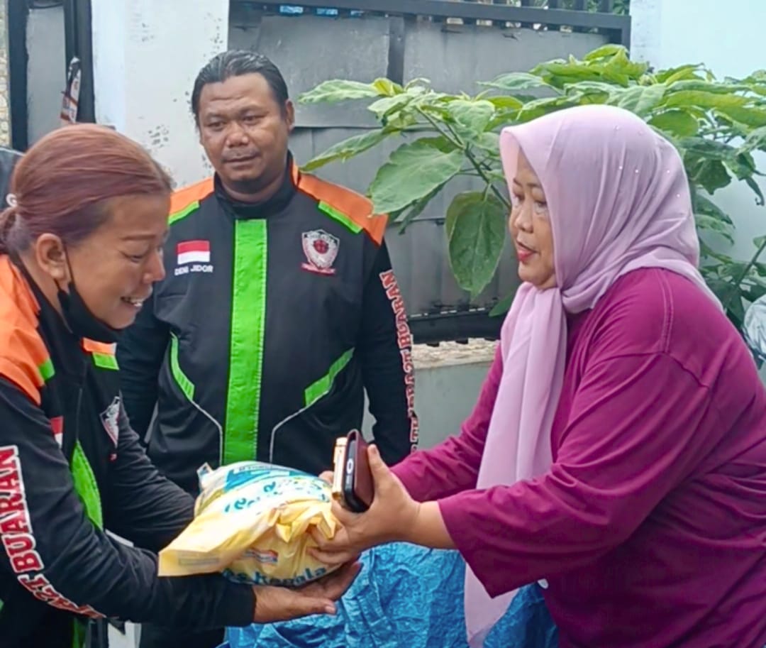 “JUM’AT BERKAH”: Pemred Media Sudut Pandang, Umi Sjarifah saat membagikan “Jum’at Berkah” ke komunitas ojol Sobat Buaran II, Jum’at (16/1/2026). (Foto: istimewa).