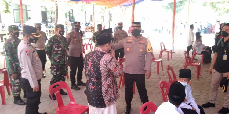 Demak – bedanews.com – Polres Demak menggelar vaksinasi serentak bagi pesantren dan rumah ibadah sinergi Polri dan Staf Khusus Presiden RI sekaligus Bansos peduli, Selasa (07/09/2021), bertempat di Pondok Pesantren (Ponpes) Kyai Gading, Desa Candisari, Kecamatan Mranggen, Kabupaten Demak.