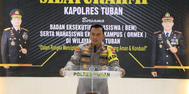 Tuban – bedanews.com – Kapolres Tuban, AKBP Darman, S.I.K gelar silaturahmi bersama Badan Eksekutif Mahasiswa (BEM) Tuban serta Organisasi Mahasiswa Ekstra Kampus (ORMEK) Tuban, bertempat di Gedung Sanika Satyawada Polres Tuban, Kamis (14/04) sore.