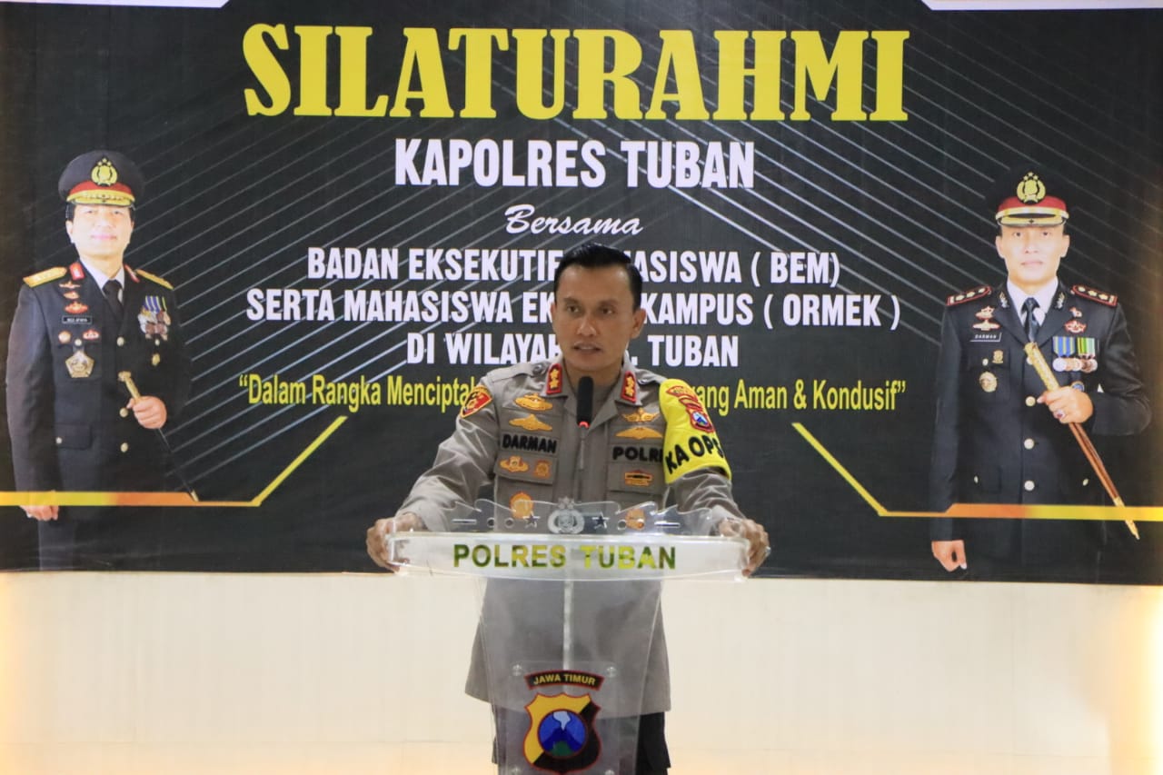 Tuban – bedanews.com – Kapolres Tuban, AKBP Darman, S.I.K gelar silaturahmi bersama Badan Eksekutif Mahasiswa (BEM) Tuban serta Organisasi Mahasiswa Ekstra Kampus (ORMEK) Tuban, bertempat di Gedung Sanika Satyawada Polres Tuban, Kamis (14/04) sore.