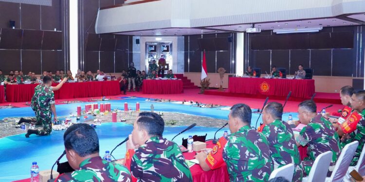 Jakarta – “Penekanan yang ingin saya sampaikan, setelah saya sudah mendengarkan paparan oleh para Dansatgas yang ada disini mengenai pengamanannya, inilah pentingnya kita koordinasi ketat dan melekat antar Satgas’’. Hal tersebut disampaikan Kepala Staf Umum (Kasum) TNI Letnan Jenderal TNI Bambang Ismawan, S.E., M.M. dalam menerima paparan para Dansatgas Pra TFG (Tactical Floor Game) KTT World Water Forum Ke-10 tahun 2024 yang di gelar di Aula Gatot Subroto, Mabes TNI, Cilangkap, Jakarta Timur, Selasa (7/5/2024).