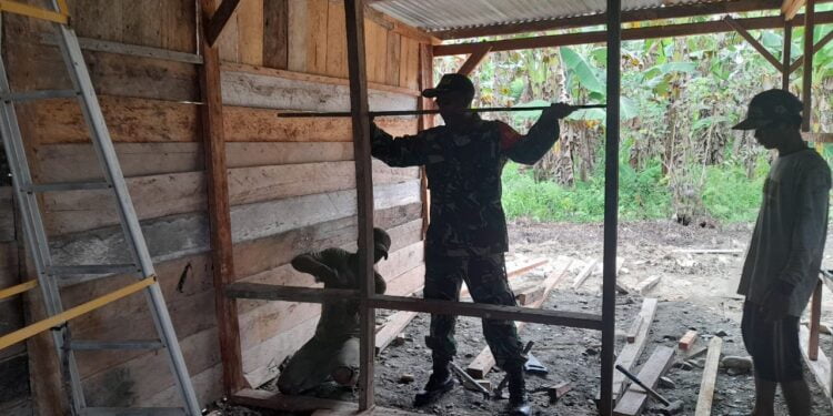 Timika, bedanews.com | Babinsa Koramil 1710-07/Mapurujaya, Sertu Imam membantu membangun rumah milik Bapak Ribut yang merupakan salah satu warga binaanya di Kampung Tipuka, Distrik Mimika Timur, Kab. Mimika, Selasa (15/11/2022).