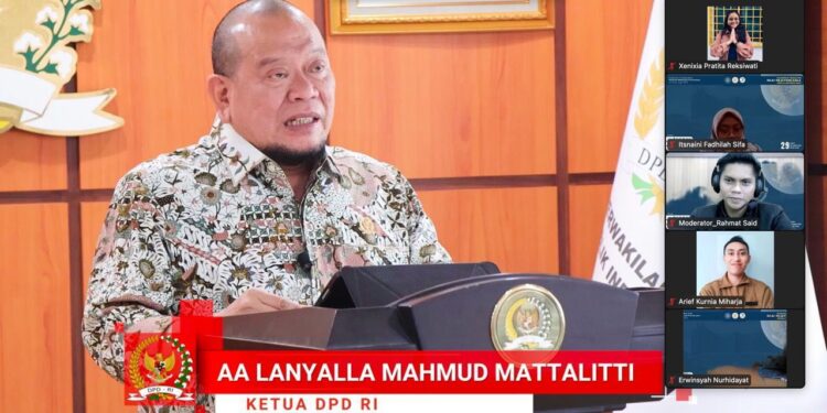 Hal itu ditegaskan LaNyalla dalam Seminar Nasional III secara virtual yang dihelat Himpunan Mahasiswa Pasca Sarjana Universitas Gadjah Mada dengan tema “Kolaborasi Nilai-Nilai Pancasila Menuju Indonesia Emas”, Sabtu (29/10/2022).