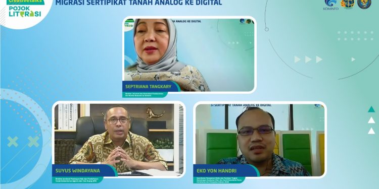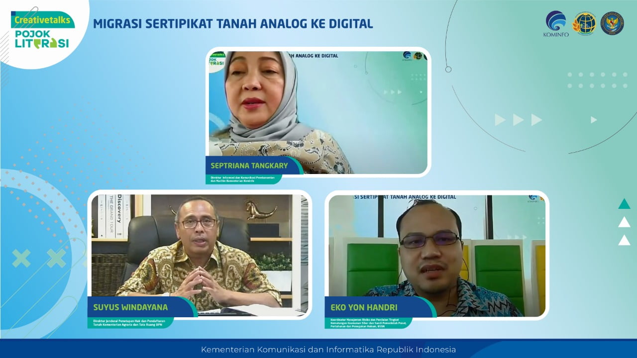 Demikian disampaikan Direktur Informasi dan Komunikasi Perekonomian dan Maritim Kementerian Kominfo, Septriana Tangkary yang mewakili Direktur Jenderal Informasi dan Komunikasi Publik Kementerian Kominfo, Usman Kansong, dalam sambutannya membuka acara webinar Creative Talks Pojok Literasi “Migrasi Sertifikat Tanah dari Analog ke Digital”, pada tanggal (5 November 2021).