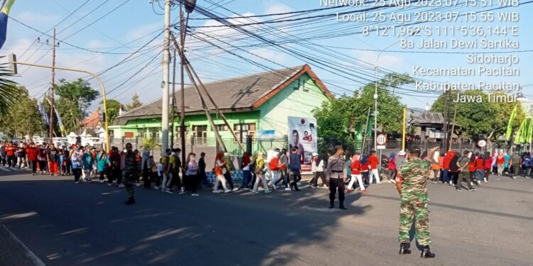Kemudian, agar kegiatan tersebut berjalan tertib, aman dan lancar, Koramil 0801/01 Pacitan, Kodim 0801/Pacitan bersama pihak Kepolisian melaksanakan pengamanan di beberapa titik persimpangan jalan yang menjadi rute jalan sehat.