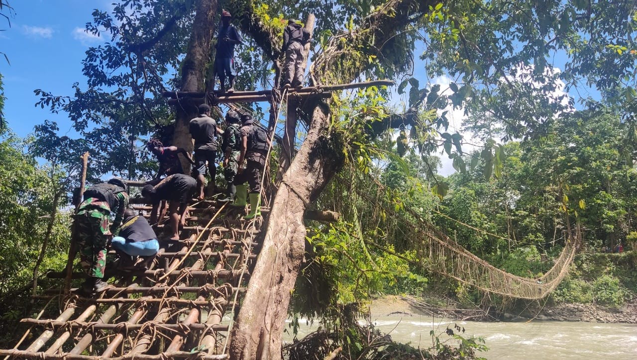 Seperti halnya yang dilakukan oleh anggota TNI dari Satgas Yonif 143/TWEJ Pos Iwur yang pada kesempatan ini bersama masyarakat memperbaiki jembatan yang menjadi akses utama Iwur ke wilayah oksibil dan sebaliknya di sungai Digoel, Kampung Dipol, Distrik Iwur, Kab. pegunungan Bintang, Papua Pegunungan, Sabtu (13/05/2023).