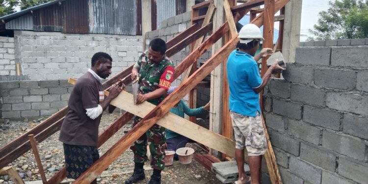 Timika, bedanews.com — Babinsa Koramil 1710-07/Mapurujaya Serda Yulius Nampe bersama perangkat kampung dan warga Kp. Muare Distrik Mimika Timur, Kabupaten Mimika bergotong royong melaksanakan kerja bakti rehab Balai Kampung, Jumat (3/3/2023).