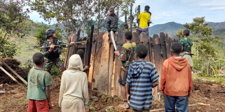 Lestarikan Budaya Gotong Royong, Satgas Yonif R 321/GT Bangun Honai Bersama Masyarakat Distrik Mbua Papua