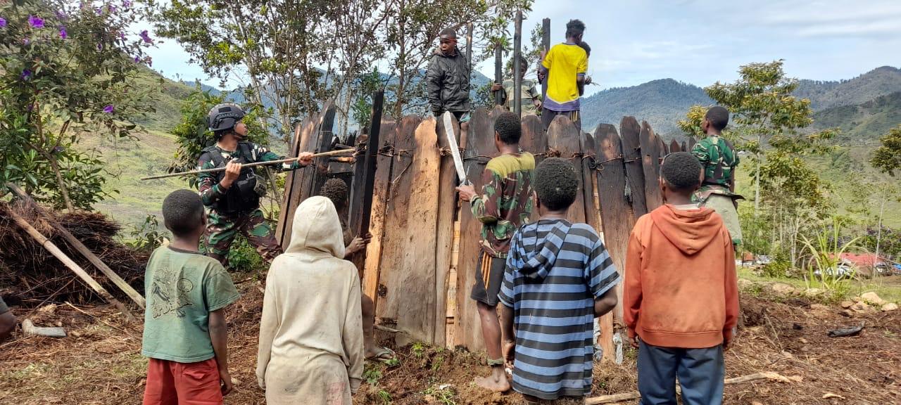 NDUGA – bedanews.com – Dalam rangka menjaga dan melestarikan kearifan lokal, personel Pos Kotis Mbua Satgas Yonif Raider 321/GT/13/1 Kostrad turut serta dalam pembangunan Honai yang merupakan rumah adat asli Papua milik Bapak Kelin (48), bertempat di Distrik Mbua, Kabupaten Nduga, Papua.