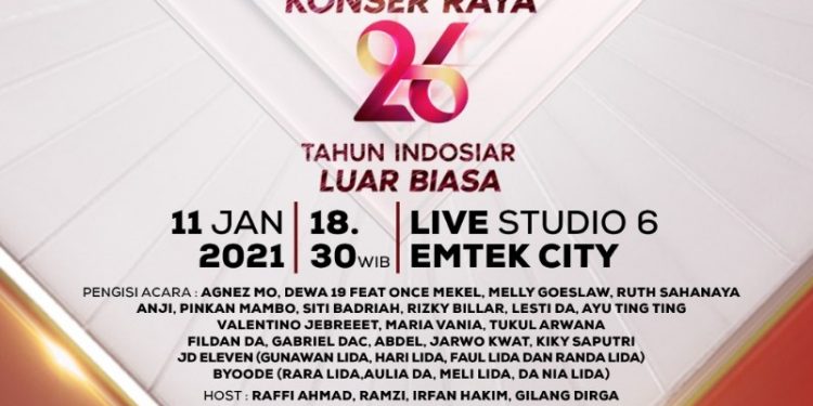 JAKARTA – Kemeriahan HUT Indosiar ke 26 tahun akan berlanjut pada “Konser Raya 26 Tahun Indosiar Luar Biasa” yang akan hadir dengan deretan musisi serta bintang Indosiar yang tidak kalah menariknya pada tanggal 11 Januari 2021 yang disiarkan secara LIVE oleh Indosiar dari Studio 6 EMTEK City pukul 18.30 WIB.