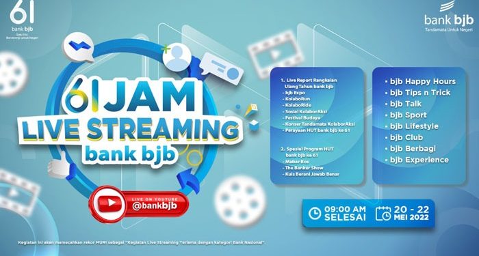 Live Streaming 61 Jam Non Stop bank bjb akan memecahkan rekor MURI yang akan ditayangkan melalui channel Youtube bank bjb selama 61 jam (2 hari 13 jam) mulai Jumat 20 Mei 2022 pukul 09.00 WIB hingga Minggu 22 Mei 2022 pukul 22.00 WIB.