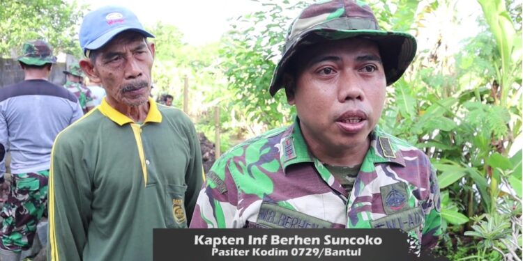 Bantul – Kapten Inf MB. Berhen Suncoko yang kesehariannya bekerja sebagai Perwira Seksi Teritorial di Staf Ter Kodim 0729 Bantul mempunyai tugas berat dalam penyelenggaraan tugas-tugas Teritorial. Tugas itu meliputi kegiatan Bhakti TNI, Pembinaan Perlawanan Wilayah dan Komunikasi Sosial. Tentunya, pekerjaan itu sangatlah berkaitan dengan suksesnya pelaksanaan TMMD Reguler ke-119 Kodim 0729 Bantul yang dilaksanakan di Dusun Tangkil, Kal. Muntuk & Dusun Salam, Kalurahan Temuwuh, Kapanewon Dlingo, Kabupaten Bantul.