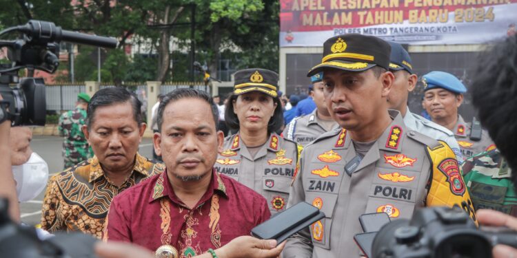 Kota Tangerang – bedanews.com – Jelang malam pergantian tahun di wilayah hukum Polres Metro Tangerang Kota, Polda Metro Jaya, Kapolres Metro Tangerang Kota, Kombes Pol Zain Dwi Nugroho bersama Pj Wali Kota Tangerang, Nurdin memimpin Apel Kesiapan Pengamanan Gabungan, Minggu, (31/12/2023) sore WIB.