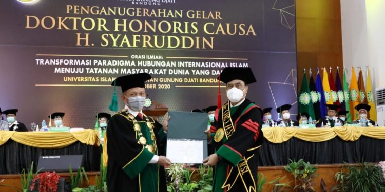 BANDUNG, BEDAnews.com – Mantan Wakil Kepolisian RI Komjen Pol (Purn) Syafruddin, mendapatkan gelar Doktor Honoris Causa (HC) melalui sidang terbuka Universitas Islam Negeri (UIN) Sunan Gunung Djati, di gedung Anwar Musaddad yang disiarkan secara langsung melalui kanal Youtube, Kamis (15/10/2020).