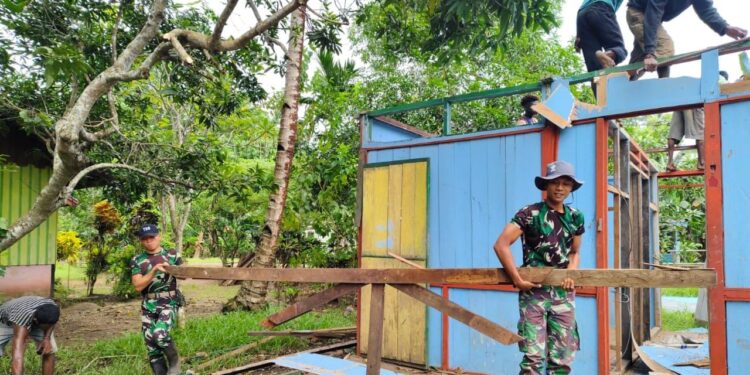 Terlihat, Serda Gilang memimpin langsung anggotanya untuk membantu renovasi rumah warga setelah mendapat laporan dari ondo api Kampung Yanggandur beberapa hari yang lalu.
