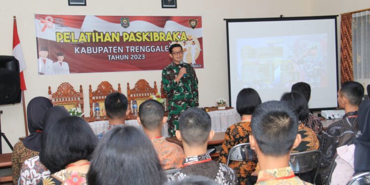 Trenggalek – bedanews.com – Dalam rangka memupuk semangat kebangsaan dan cinta tanah air, Dandim 0806/Trenggalek, Letkol Kav Peddy Adi Prasetyo, S.Sos menggelar sebuah kegiatan inspiratif di hadapan pemuda-pemudi yang berkecimpung dalam tim Paskibraka tahun 2023. Bertempat di Aula Dinas Perindustrian dan Tenaga Kerja Kabupaten Trenggalek, kegiatan ini dihadiri oleh berbagai tokoh penting, termasuk Kepala Bakesbangpol Kabupaten Trenggalek, Drs. Widarsono, M.M, Kabid Ideologi Wawasan Kebangsaan dan Karakter Bangsa Bakesbangpol Kabupaten Trenggalek, Sugito, S.Sos, M.M, serta pelatih dan pendamping Paskibraka sebanyak 72 orang, Selasa (8/8/2023) malam.