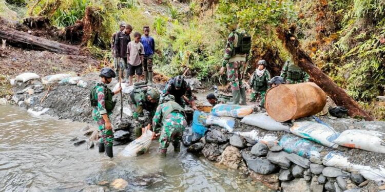 NDUGA – bedanews.com – Satgas Yonif Raider 321/GT/13/1 Kostrad bersama warga bergotong royong membangun jembatan yang merupakan akses utama masyarakat di Distrik Dal, Kabupaten Nduga, Papua.