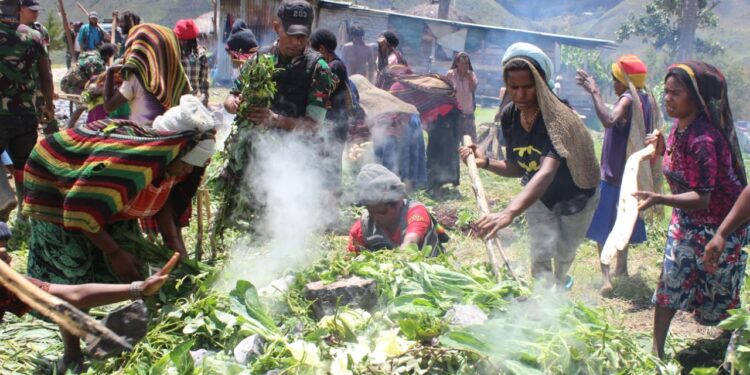 LANNY JAYA, bedanews.com – Personel Satgas Yonif Mekanis 203/AK yang dipimpin langsung oleh Dansatgas Letkol Inf Achmad Zaki, S.Sos.,M.M.,M.I.Pol mengadakan acara adat bakar batu dalam rangka memperingati HUT Kodam Jaya ke-73 di Distrik Tiom, Kabupaten Lanny Jaya, Sabtu (24/12/2022).