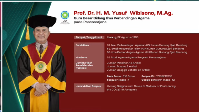 Demikian disampaikan Prof.Dr.Yusuf Wibisono, M.Ag ketika pidato Ilmiah pengukuhanya sebagai Guru Besar Bidang Ilmu Perbandingan Agama oleh oleh Prof.Dr.Rosihon Anwar,M.Ag didampingi Ketua dan Sekretaris Senat Universitas, Prof. Dr.Mahmud, M.Si., Prof. Dr. Asep Muhyiddin, M.Ag., bersama 19 Guru Besar lainnya dalam Sidang Senat Terbuka bertajuk “Membumikan Kepakaran, Menguatkan Kebermanfaatan, Mengunggulkan Kontribusi Nyata bagi Peradaban.”Pengukuhan yang berlangsung di Gedung Anwar Musaddad dan disiarkan langsung melalui kanal YouTube UIN Sunan Gunung Djati Bandung, Rabu, (23/4/2025).