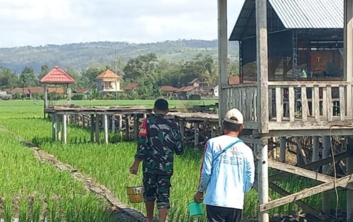 Dalam pelaksanaannya, Serda Sujarwo secara langsung terlibat dalam proses pemupukan padi bersama para petani setempat.
