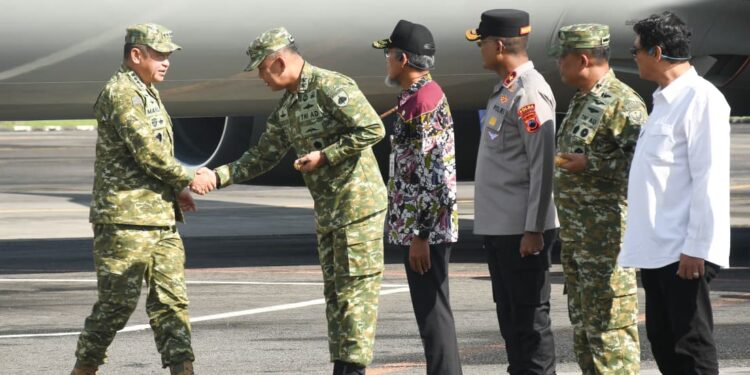 SEMARANG || Bedanews.com – Pangdam IV/Diponegoro, Mayjen TNI Achiruddin, S.E, M.Han, menyambut kunjungan kerja Menteri Pertahanan RI, Jenderal TNI (Purn) Dr. Sjafrie Sjamsoeddin dan Panglima TNI, Jenderal TNI Agus Subiyanto, S.E., M.Si, di Lanumad Ahmad Yani, Kamis (23/4/2026).