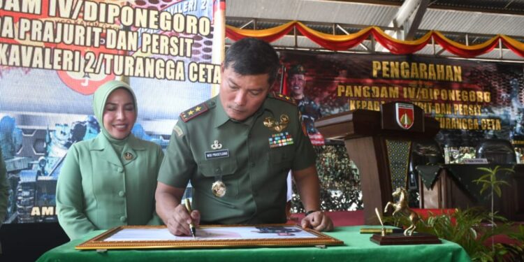 Ambarawa – bedanews.com – Panglima Kodam IV/Diponegoro, Mayjen TNI Widi Prasetijono didampingi Ketua Persit KCK PD IV/Diponegoro, Ny. Novita Widi Prasetijono, kunjungi Markas Komando Yonkav 2/Turangga Ceta di Ambarawa, Semarang. Guna memberikan pengarahan sekaligus motivasi sekaligus penekanan kepada seluruh prajurit, Rabu (20/07/2022).