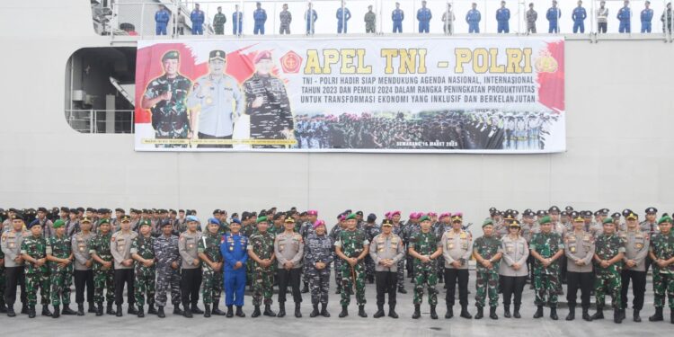 Semarang – bedanews.com – Pangdam IV/Diponegoro, Mayjen TNI Widi Prasetijono didampingi Kapolda Jateng, Irjen. Pol. Drs. Ahmad Luthfi, S.St.Mk, S.H dan Danlanal Semarang, Kolonel Mar Hariyono Masturi, M.Tr.Hanla, M.M pimpin pelaksanaan apel bersama TNI-Polri di wilayah Jateng TA. 2023 di Dermaga Lanal Semarang. Dengan tema “TNI-Polri Jateng Hadir, Siap Mendukung Agenda Nasional, Internasional Tahun 2023 dan Pemilu 2024, Dalam Rangka Peningkatan Produktivitas Untuk Transformasi Ekonomi Yang Inklusif dan Berkelanjutan”, Rabu (15/03/2023).