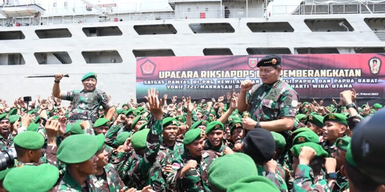 Makassar – bedanews.com – Panglima TNI Laksamana TNI H. Yudo Margono, S.E., M.M bersama Ketua Umum Dharma Pertiwi Ibu Vero Yudo Margono didampingi Pangdam XIV/Hasanuddin Mayjen TNI Totok Imam Santoso, S.I.P., S.Sos., M.Tr. (Han)., Pangdam VI/ Mulawarman Mayjen TNI Tri Budi Utomo dan Pejabat Utama (PJU) Mabes TNI beserta para Forkopimda Prov. Sulsel serta Forkopimda Kota Makassar melepas keberangkatan Satuan Tugas (Satgas) Pengamanan Perbatasan (Pamtas) RI-PNG Kewilayahan Provinsi Papua dan Papua Barat Yonif 721/Makassau dan Yonif 623/Bhakti Wira Utama bertempat di Pelabuhan Soekarno–Hatta Makassar, Jumat (31/03/2023).