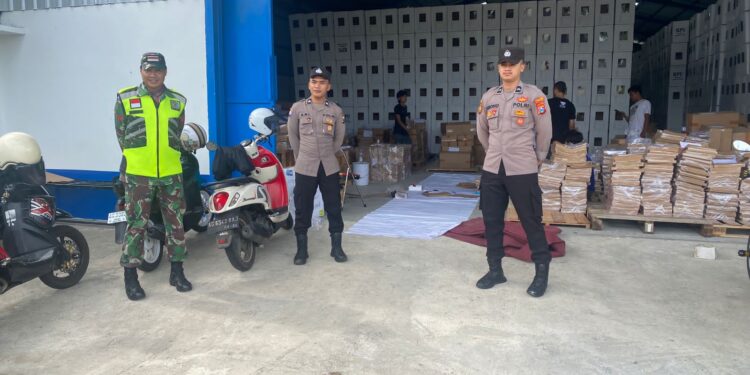 Tulungagung – bedanews.com – Babinsa Siyotobagus, Koptu Didiek anggota Koramil Tipe B 0807/12 Besuki bersama anggota Polri dan petugas keamanan melaksanakan kegiatan pengamanan di Gudang Logistik Pemilu Talapan Kelurahan Tamanan Kecamatan Tulungagung, Kabupaten Tulungagung, Jawa Timur, Kamis (18/01/2024).