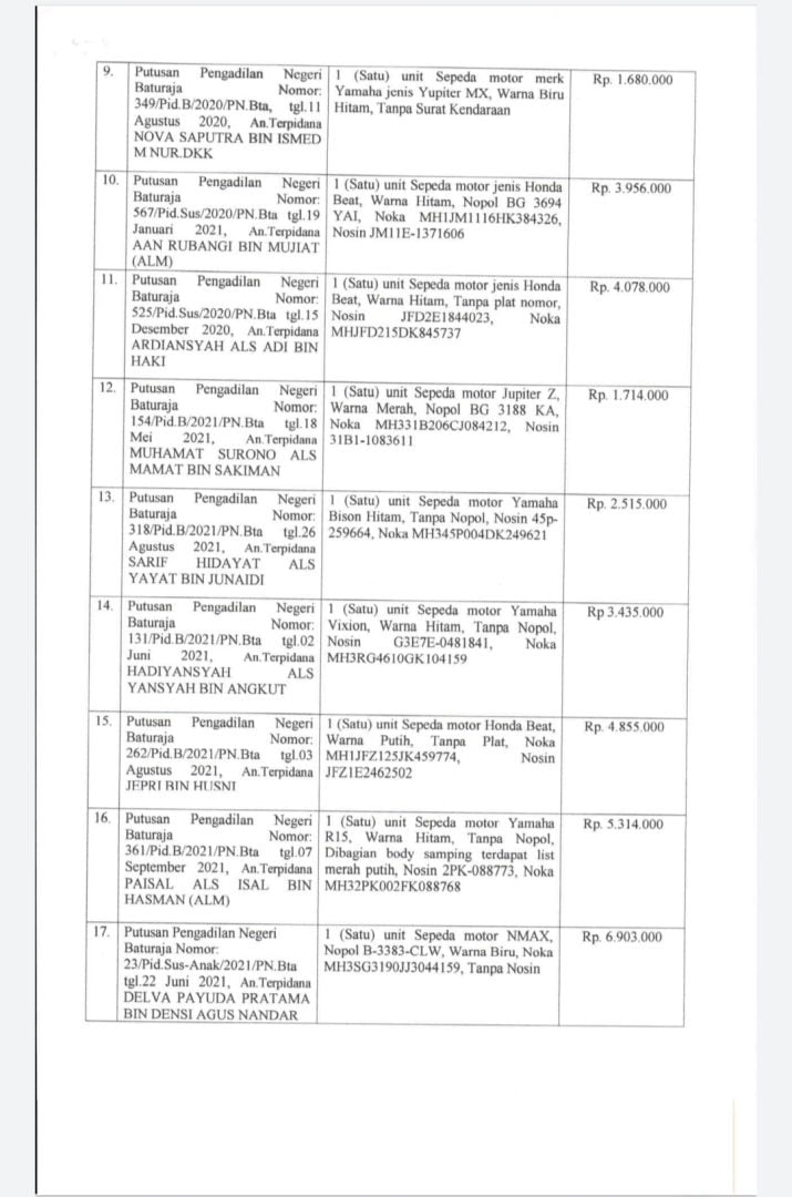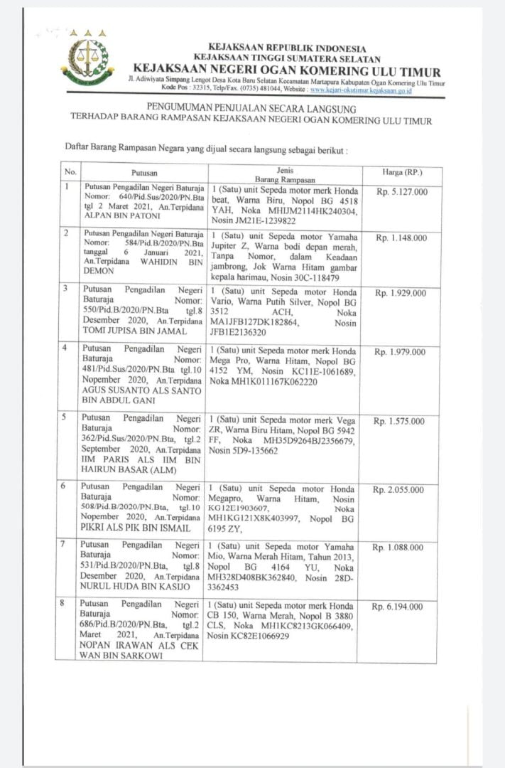 Pelelangan ataupun penjualan langsung ini dilakukan dalam rangka kegiatan penyelesaian barang bukti dan barang rampasan serta hasil lelang atau pun penjualan langsung tersebut sebagai salah satu sumber Penerimaan Negara Bukan Pajak (PNBP) khususnya di Kantor Kejaksaan Negeri Oku Timur.