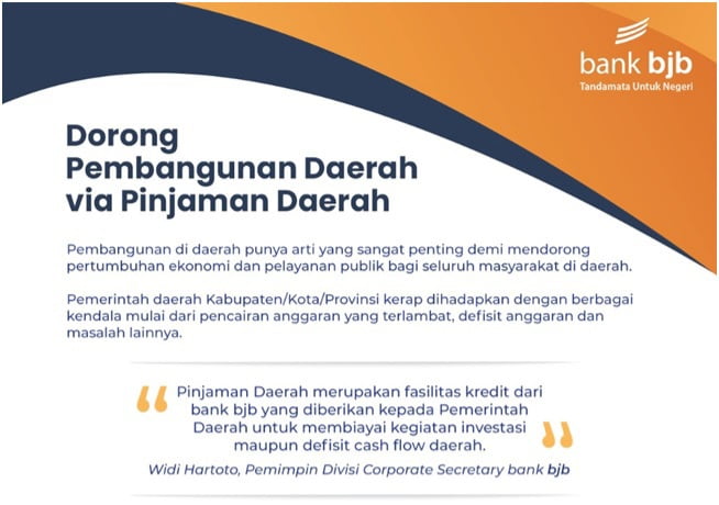Pemimpin Divisi Corporate Secretary bank bjb, Widi Hartoto mengatakan bank bjb sebagai mitra strategis pemerintah daerah senantiasa mendukung kegiatan pembangunan daerah melalui fasilitas pembiayaan.