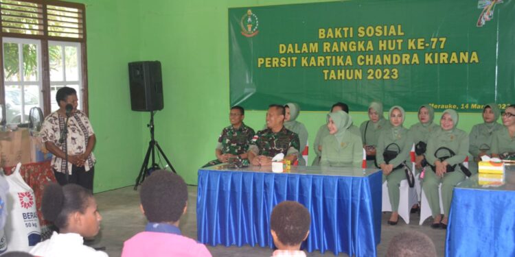 Merauke, bedanews.com —  Memperingati HUT Persit Kartika Chandra Kirana Ke-77, Danrem 174/ATW Brigjen TNI Agus Widodo, S.I.P., M.Si. bersama Ketua Persit Koorcab Rem 174 Ny. Ane Agus Widodo melaksanakan bakti sosial dengan menyambagi anak-anak yang berada di panti asuhan.