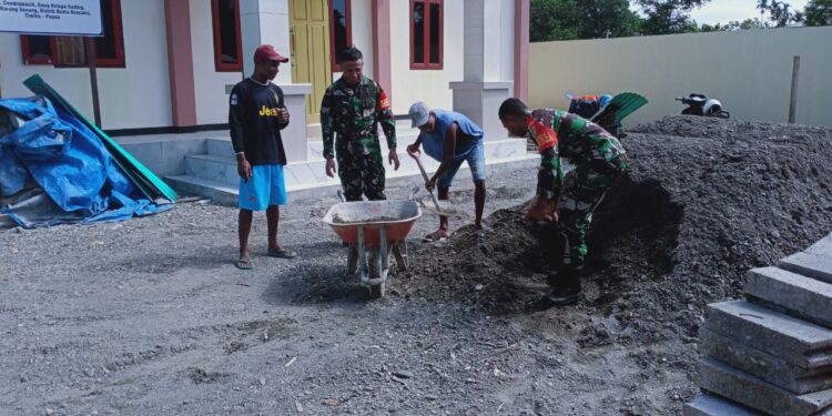 Timika, bedanews.com — Wujud kerja nyata Babinsa Koramil 1710-02/Timika bersama-sama warga masyarakat tampak saat kegiatan gotong royong melaksanakan perbaikan sarana ibadah berupa gereja bersama Jamaat GBI Siam pimpinan Bapak Marthen di Kp. Ninabua Distrik Mimika Baru, Kab. Mimika, Selasa (17/01/2023).