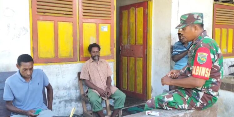 Timika, bedanews.com ~ Babinsa Koramil 1710-07/Mapurujaya Sertu Selamet Riyadi melaksanakan Komunikasi Sosial (Komsos) bersama masyarakat di Kp. Ayuka, Distrik Mimika Timur Jauh, Kab. Mimika dengan tujuan untuk menciptakan kedekatan bersama warga binaan serta memperkokoh kemanunggalan, Jumat (26/4/2024).