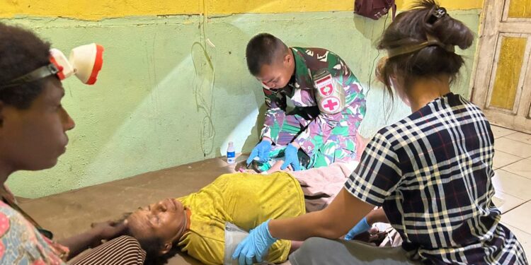 Merauke – Personel Pos Kondo Satgas Pamtas Yonif 726/Tml bergerak cepat membantu proses evakuasi ibu hamil yang mengalami pendarahan untuk dibawa ke Puskesmas Pembantu (Pustu) Kampung Kondo, Distrik Naukenjerai, Jumat (08/03/2024).