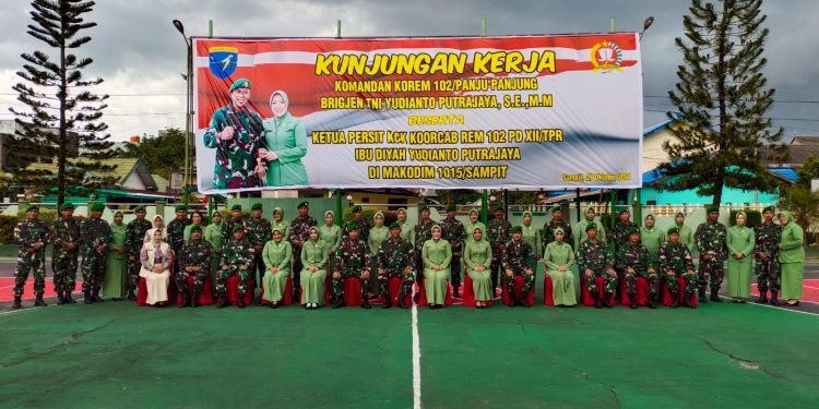Kotawaringin Timur – bedanews.com – Dandim 1015/Sampit, Letkol Czi Akhmad Safari, S.H di dampingi Ibu Ketua Persit Kartika Chandra Kirana (KCK) Cabang XLI Kodim 1015/Sampit, Ny. Dini Akhmad Safari secara langsung menyambut kedatangan Danrem 102/Panju Panjung, Brigjen TNI Yudianto Putrajaya, SE, MM di dampingi Ibu Ketua Persit KCK Koorcab Rem 102 PD XII/Tanjung Pura, Ny. Diyah Yudianto Putrajaya di Makodim 1015/Sampit, Rabu (27/10).