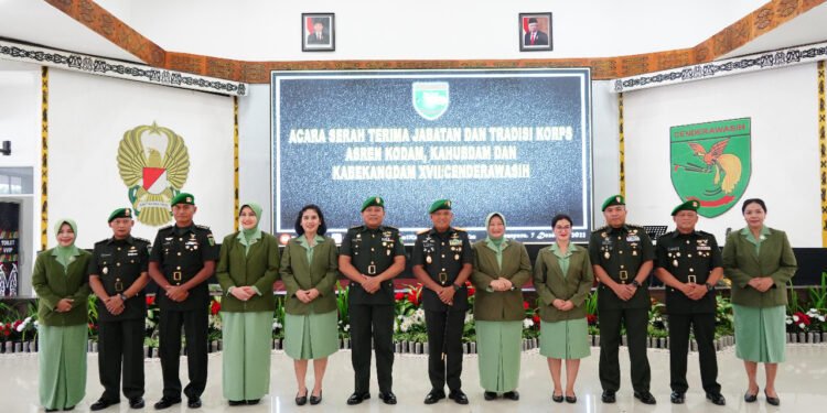 Jayapura, bedanews.com – Pangdam XVII/Cenderawasih Mayjen TNI Muhammad Saleh Mustafa, memimpin acara Serah Terima Jabatan (Sertijab) dan Tradisi Korps Pejabat Kodam XVII/Cenderawasih, bertempat di Aula Tonny A Rompis Makodam XVII/Cenderawasih, Jayapura, Rabu (7/12/2022). Demikian disampaikan Kapendam XVII/Cenderawasih Kolonel Kav Herman Taryaman, S.I.P., M.H dalam keterangannya.