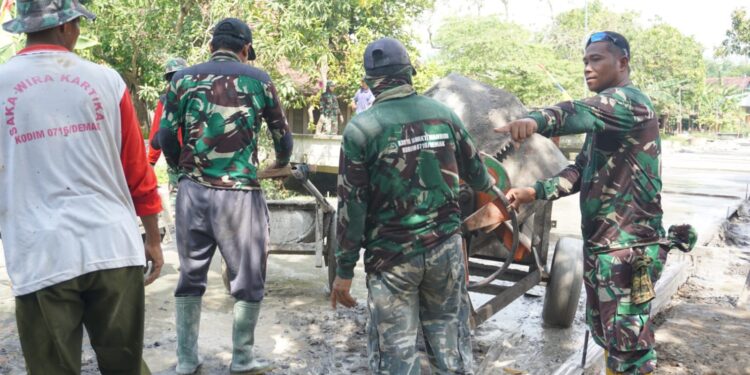 Demak – bedanews.com – Panas terik matahari yang menyengat kulit di Dusun Mintreng, Desa Kebonagung, Kecamatan Kebonagung tak menyurutkan anggota satgas TMMD Reguler Ke 114 Kodim 0716/Demak dalam pengerjaan sasaran fisik pengecoran jalan.