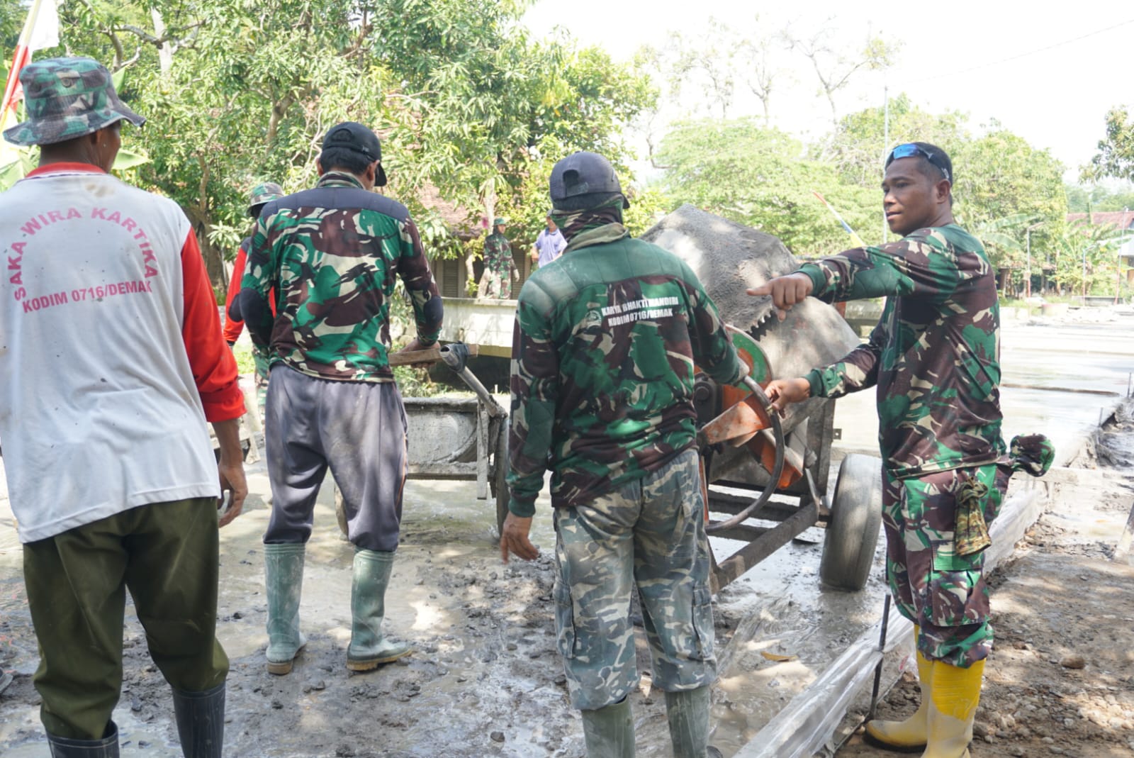 Demak – bedanews.com – Panas terik matahari yang menyengat kulit di Dusun Mintreng, Desa Kebonagung, Kecamatan Kebonagung tak menyurutkan anggota satgas TMMD Reguler Ke 114 Kodim 0716/Demak dalam pengerjaan sasaran fisik pengecoran jalan.