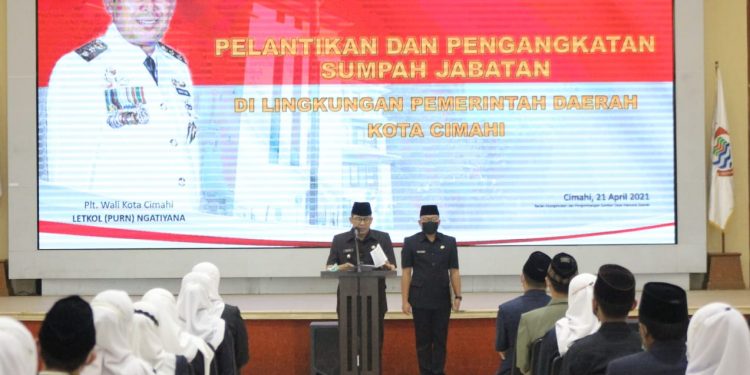 CIMAHI, BEDAnews.com – Pelaksana tugas (Plt.) Wali Kota Cimahi Letkol Inf. (Purn) Ngatiyana melantik dan mengangkat 58 pejabat fungsional tertentu di lingkungan Pemerintah Kota (Pemkot) Cimahi, di Aula Gedung Cimahi Techno Park, Jalan Baros, Utama, Cimahi Selatan, Kota Cimahi, Rabu (21/04/2021).