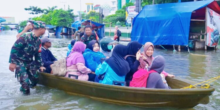 Semarang – bedanews.com, Dandim 0733/KS Kolonel Inf Rahmad Saerodin, S.I.P., M.I.Pol., didampingi Danramil 06/Genuk Mayor Inf Rahmatullah AR. S.E. M.M., bersama Kepolisian Jateng dan BPBD terjun langsung meninjau lokasi banjir di Kec. Genuk, Kota Semarag, tepatnya di seputaran jalan raya Kaligawe Kelurahan Terboyo Kulon kecamatan Genuk Kamis (14/03/2024).