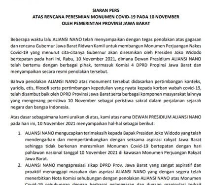 Lewat release yang diterima redaksi, Aliansi Nano Jabar mengucapkan terimakasih kepada Bapak Presiden Joko Widodo yang telah mendengarkan dan mempertimbangkan dengan seksama aspirasi rakyat Jawa Barat, sehingga tidak berkenan meresmikan Monumen Covid-19 bertepatan dengan hari pahlawan nasional tanggal 10 November 2021 di kawasan Monumen Perjuangan Rakyat Jawa Barat.