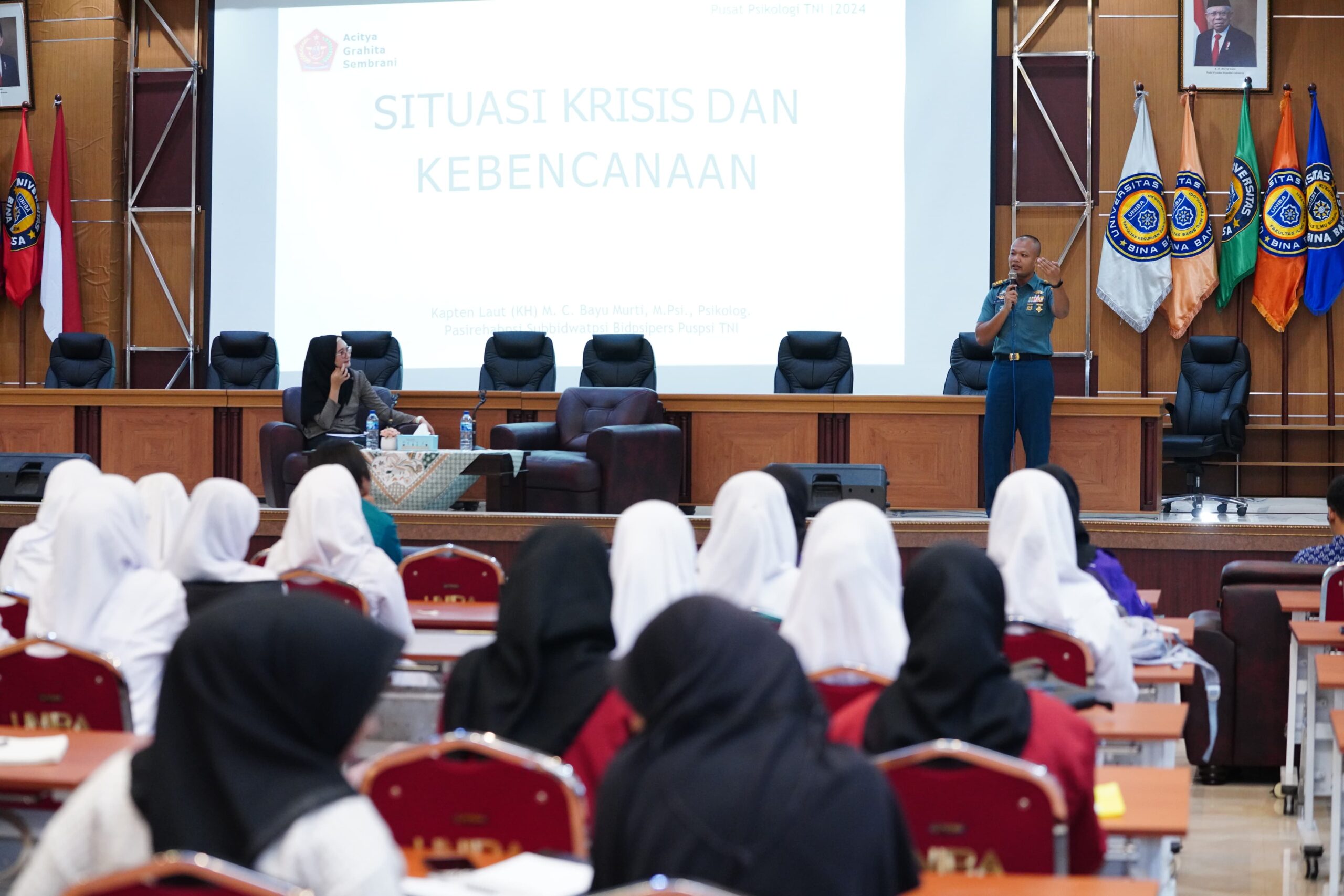 Menyoroti pentingnya peran psikologi dalam mendukung kesejahteraan mental dan emosional, Kapuspsi TNI dalam keterangannya yang disampaikan oleh Kapten Laut (KH) Bayu Murti, M.Psi, Psikolog., mengatakan bahwa kegiatan ini bertujuan untuk memberikan pembekalan kepada mahasiswa terkait dengan pertolongan psikologis awal terhadap korban bencana, diharapkan mahasiswa memiliki keterampilan dalam mitigasi dampak bencana pada penyintas, dimana Indonesia adalah negara yang rawan bencana.