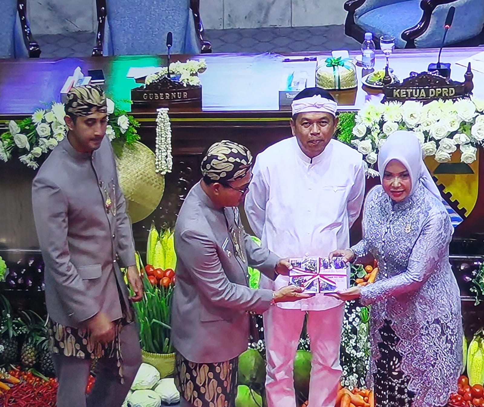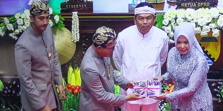 KAB. BANDUNG || bedanews.com — Ketua DPRD Kabupaten Bandung Hj. Renie Rahayu Fauzi, saat Sidang Paripurna dalam memperingati Hari Jadi Kabupaten ke 385 tahun, Senin 20 Aprik 2026, menyampaikan kearifan lokal Sunda tentang menjaga alam, yaitu: “Gunung kaian, gawir awian, cinyusu rumateun, sempalan kebonan, pasir talunan, lebak caian/sawahan” ((gunung ditanami pohon, tebing ditanami bambu, mata air dirawat, lahan terbuka dijadikan kebun, bukit digarap, dan lembah dijadikan sawah atau pengairan).