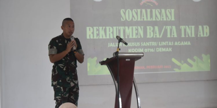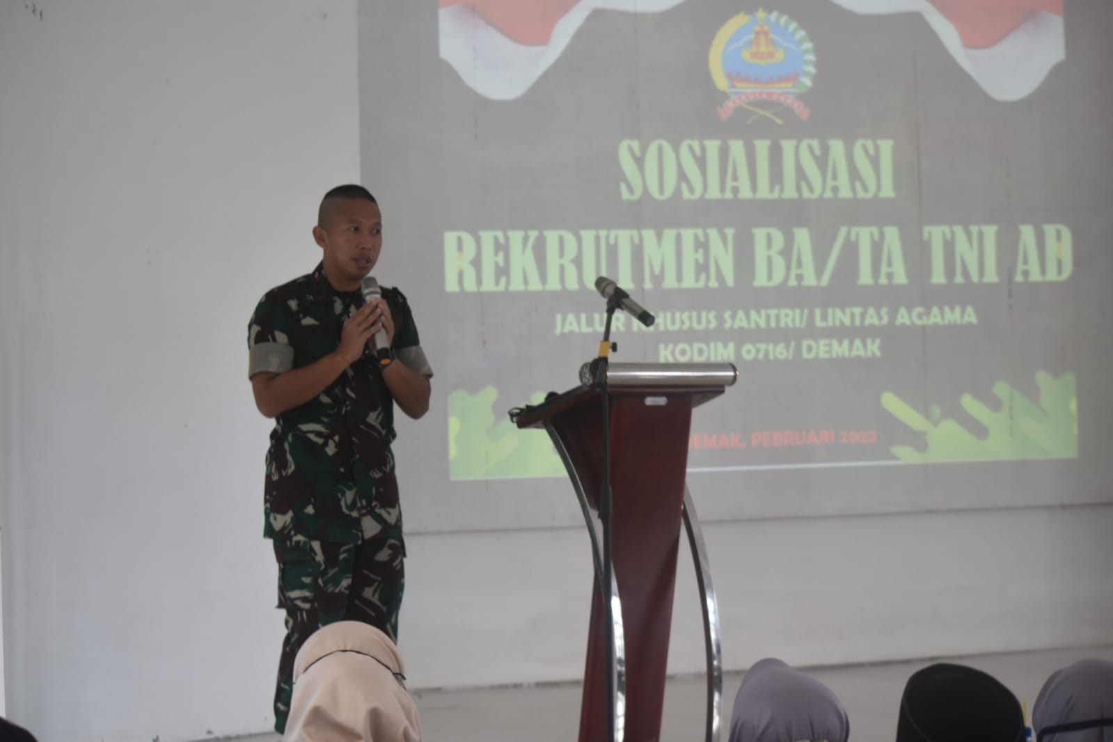 Untuk itu, Kodim 0716/Demak menggelar sosialisasi rekrutmen kepada santri dan pelajar di aula serbaguna Pesantren Girikesumo dan Yayasan Kyai Ageng Giri, Desa Banyumeneng, Kecamatan Mranggen, Rabu (16/02/2022).