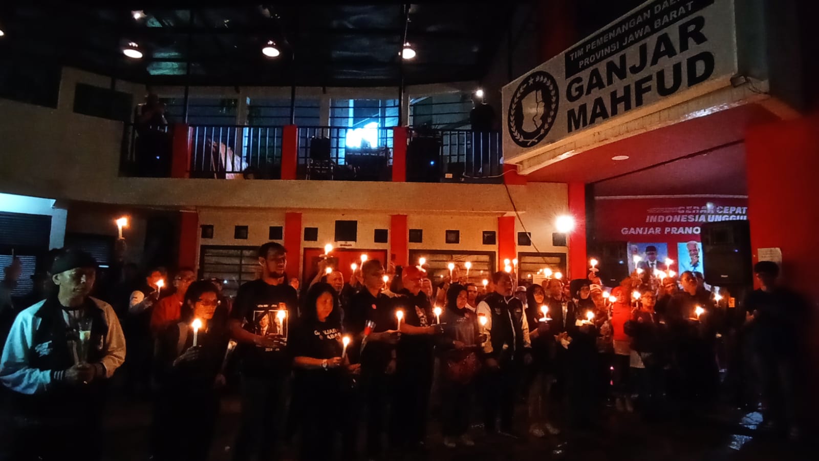 BANDUNG – Ratusan orang berkumpul di Sekretariat Tim Pemenangan Daerah Ganjar Pranowo-Mahfud MD Jawa Barat, Sabtu (6/1/2024) malam. Mereka pun memegang lilin dan membawa bunga.