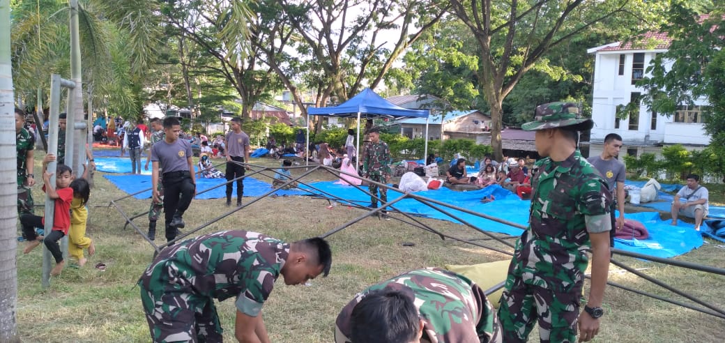 Respons cepat tanggap bencana alam ditunjukkan Prajurit TNI AD dari satuan Korem 142/Tatag dan Kodim 1418/Mamuju dalam membantu warga terdampak bencana dengan mendirikan tenda pengungsian berlokasi di Stadion Manakarra Mamuju sesaat setelah gempa tektonik berkekuatan 5,8 magnitudo melanda kawasan pantai barat Mamuju Provinsi Sulawesi Barat pada hari Rabu tanggal 8 Juni 2022 pukul 12.32 WITA.