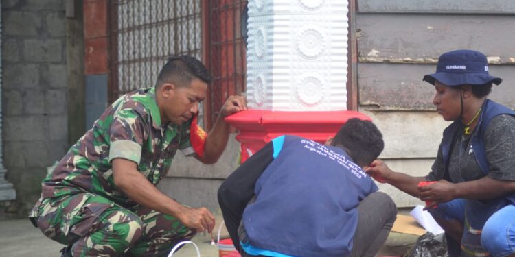 Timika, bedanews.com — Banyak hal yang bisa dilakukan untuk menyambut HUT RI ke-78, salah satunya seperti yang dilakukan oleh Babinsa Koramil 1710-02/Timika, Sertu Rusdin Wali yang mengecat gapura di wilayah binaannya. Kegiatan pengecatan gapura tersebut dilaksanakan di Kp. Mawokau Jaya, Distrik Mimika Baru, Kabupaten Mimika yang dilaksanakan bersama Mahasiswa KKN STIE Jambatan Bulan, Kamis (10/08/2023).