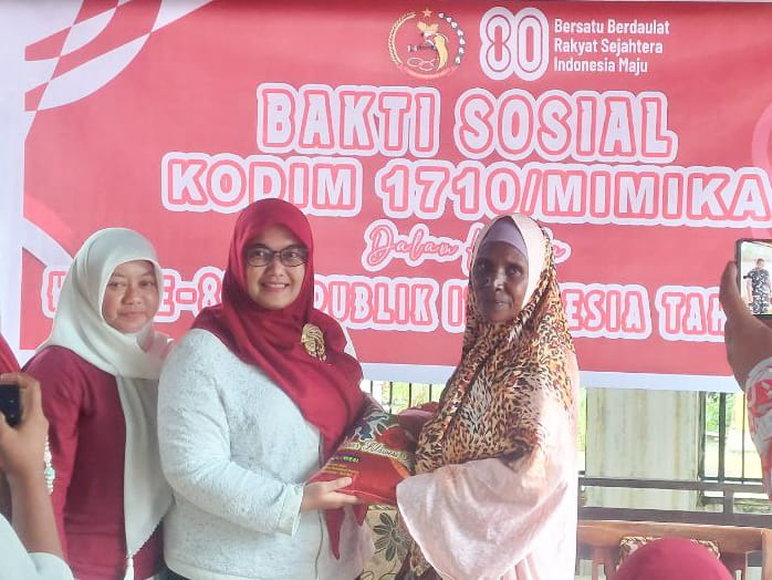 Timika, bedanews.com – Dalam rangka menyambut HUT Kemerdekaan Republik Indonesia Ke-80 Tahun 2025, Kodim 1710/Mimika menggelar kegiatan bakti sosial berupa bantuan sembako kepada kaum Dhuafa dan Mualaf di Rumah Quran, Masjid Al Haq Kp. Pomako, Distrik Mimika Timur, Kab. Mimika, dipimpin langsung Dandim 1710/Mimika Letkol Inf M. Slamet Wijaya, S.Sos,.M.Han,.M.A dan Ketua Persit KCK Cab. XXXV Ny. Ulfa Slamet Wijaya, Rabu (13/08/2025).